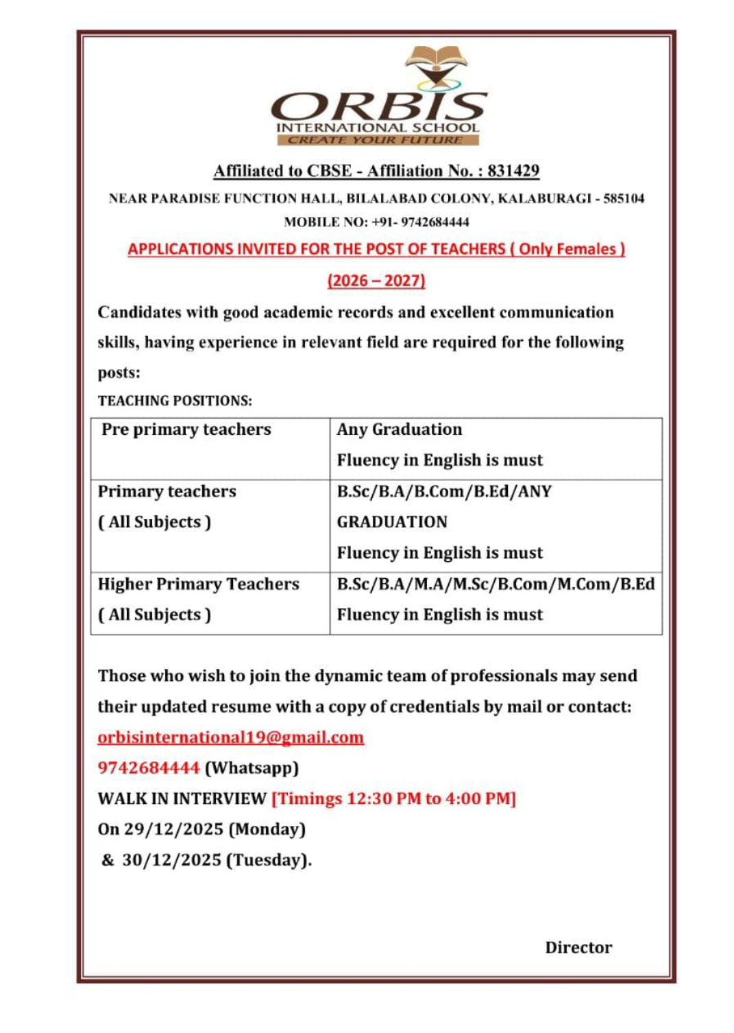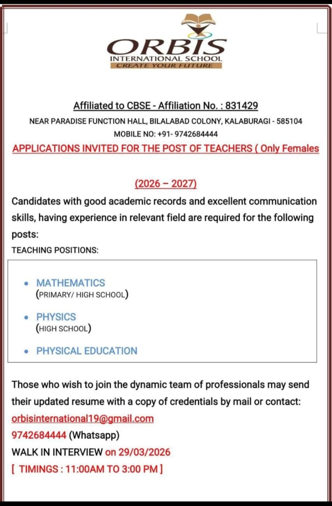| 1 | Walk-in Interview for Female Teachers – 29-03-2026 | Orbis International School, Kalaburagi (CBSE affiliated), is hiring female teachers for Mathematics, Physics, and Physical Education (Primary/High School) for the session 2026–27. Candidates must have strong academic background and fluency in English. Attend the walk-in interview on 29 March 2026 (11:00 AM – 3:00 PM) or send your resume via email/WhatsApp. | View |
